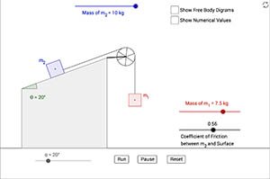 This is a simulation of two objects attached to each other with a massless string. The string passes over a massless, frictionless pulley. Use the "Run" button to start the simulation, the "Pause" button to pause it, and the "Reset" button to reset the time back to zero. Use the sliders to adjust the masses of the two objects, the angle of the incline, and the coefficient of friction between mass m2 and the incline (in the simulation it is assumed that the static and kinetic friction coefficients have the same value). Use the checkboxes to show or hide the numerical values and the free body diagrams for the two objects.