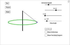 This is a simulation of a conical pendulum. A conical pendulum consists of an object attached to a string and moving in a horizontal circle. The string length in the simulation is fixed, adjust the radius, animation speed, and view angle with the sliders.