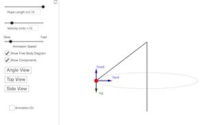 This is a 3D simulation of a conical pendulum. A conical pendulum consists of an object attached to a string and moving in a horizontal circle. Adjust the string length, velocity, animation speed, and view angle.