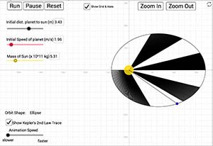 Use the sliders to adjust the initial speed of the planet, the initial distance from the center of the planet to the center of the sun, and the mass of the sun. Hit run to see the orbit animate. The orbit will be with elliptical, circular, parabolic, or hyperbolic, depending on the initial conditions. Show the Kepler's 2nd Law of planetary motion trace to see the elliptical orbit broken into eight wedges of equal area, each swept out in equal times.