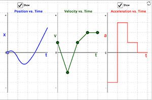 In this simulation you adjust the shape of a Velocity vs. Time graph by sliding points up or down. The corresponding Position vs. Time and Acceleration vs. Time graphs will adjust automatically to match the motion shown in the Velocity vs. Time graph. |
