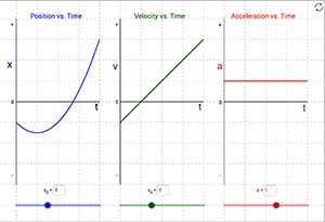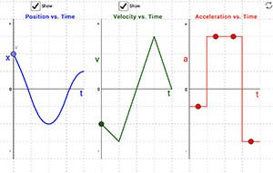 This is a simulation that shows the position vs. time, velocity vs. time, and acceleration vs. time graphs for an object. Students can adjust the initial position and initial velocity of the objects, and then adjust the acceleration of the object during the four time intervals represented on all the graphs.