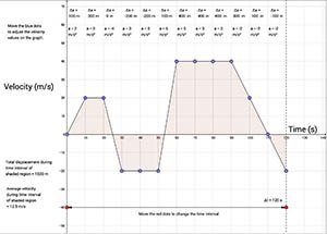 This simulation shows the velocity vs. time graph for an object moving along a straight line. Adjust the velocities by sliding the blue points up or down. Adjust the total time interval by sliding the red dots horizontally.