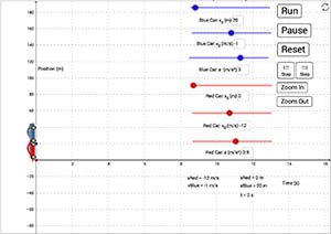 This is a simulation of two cars moving in one dimension. You can adjust the initial position, initial velocity, and acceleration of each of the cars. When the run button is pressed, you can watch an animation of the motion of the cars and also see the position vs. time graph for each of the cars. |