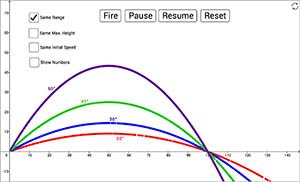 Using this simulation, students can explore various types of projectile motion. Four projectiles are launched over level ground at angles of 20, 30, 45, and 60 degrees. You have the option of setting them all to have the same horizontal range, the same maximum height, or the same initial velocity. The student can then answer conceptual questions about the time in air, and initial horizontal and vertical velocity and the initial speed. |