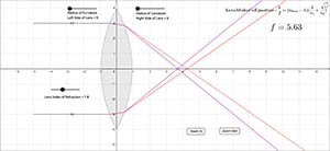 This simulation shows the bending of red and violet rays from either end of the visible spectrum as it occurs in lenses. Use the sliders to adjust the radii of the spherical lens surfaces and the index of refraction of the lens. Use the buttons to zoom in or out.