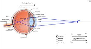 This is a simulation demonstrating the optics of the human eye. It also shows how various lenses can be used to correct for faulty vision. Be aware that it is a simplified version of what actually happens. In the simulation, there is no bending when light moves from the air into the eye (when most of the actual bending happens). Instead, in the simulation only the bendings that happen in the lens of the eye (or in the corrective lenses) is shown