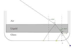 I used the actual indices of refraction given in the problem, and made the simulation to the same scale as used in the problem. The simulation shows why you see two dots at the bottom of the glass when the original angle of incidence is small enough. It also illustrates why the second dot gets brighter when the critical angle of incidence is reached at the liquid-air interface. The simulation also shows that the part of the problem about why the second dot disappears is misleading. The problem states that the second dot disappears due to total internal reflection, but you can see in the simulation that the second dot would actually disappear due to its ray not hitting the bottom of the glass container long before the critical angle for the glass-liquid interface is reached.