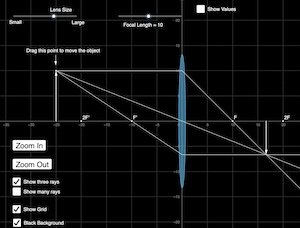 This is an new simulation that can be used to explore image formation using a convex lens. Unlike the other convex lens simulations on this site, it allows you to zoom in and out to adjust the scale, a choice of dark or light background, and a view choice with many rays of light.