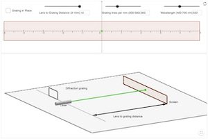This is a simulation of a typical laser diffraction lab set up. Examine the set up in the 3D window, it shows a laser, a diffraction grating, and a screen. Use the checkbox to place the grating in front of the laser, and look at the pattern of dots that appear on the screen. Use the sliders to change the distance from the grating to the screen, the number of lines per millimeter in the diffraction grating, and the wavelength of the laser. Use the diagram of the screen in the top window to analyze the numerical positions of the dots on the screen using diffraction equations.