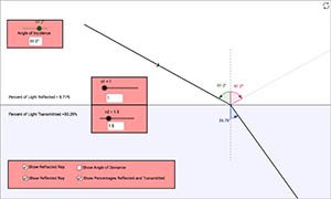 This is a simple simulation showing the reflection and refraction of a ray of light as it attempts to move from one medium to another. Use the sliders to adjust the index of refraction of each of the two materials, as well as the angle of incidence (the angle between the incident ray of light and the normal to the surface). Use the check boxes to show or hide various information.