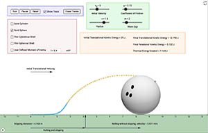 Simulation of rolling with and without slipping. Users can change the type of object (solid sphere, solid cylinder, etc.), the mass, the radius, the coefficient of friction, and the initial velocity. You can view a realistic animation of the rolling with slipping and watch as it changes to pure rolling without slipping.