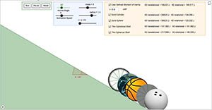 In this simulation, the user can explore the rolling motion of various objects. Use the check boxes to select one or more objects. Use the mass and radius sliders to adjust the mass and radius of the object(s). Use the Incline Angle slider to adjust the angle of the incline. Use the Run, Pause, and Reset buttons to control the animation, and the speed slider to adjust the animation speed.