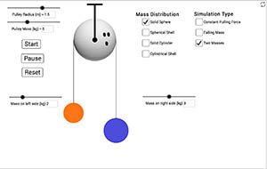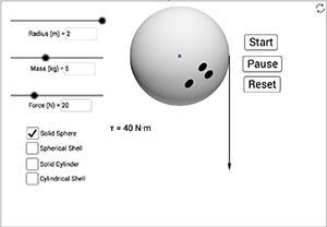 This is a simulation of a circular object mounted on an axis through its center with a constant torque applied. Objects with varying rotational inertia (solid sphere, spherical shell, solid cylinder, cylindrical shell) can be chosen, and the mass and radius of the object can be adjusted.