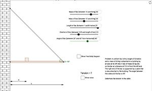 This is an adjustable equilibrium problem involving a uniform bar with a mass on it. The bar has an axis at its left end and is supported at its right end by a cable. The mass of the bar and box, the length of the bar, the position of the box and the angle of the cable can all be adjusted. Use the given quantities to determine the tension in the cable. Check your free body diagram, equations, and your determined tension.