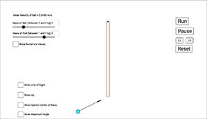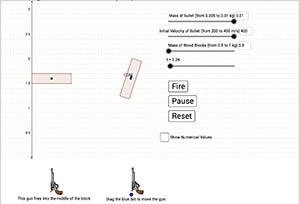 In this simulation a ball with an initial velocity strikes, and sticks to, a bar that can be thought of as floating in space (no gravity effects). The bar can have either a fixed axis or no fixed axis. Explore the linear and angular momentum of the ball-bar system before and after the collision. You can adjust the masses of the ball and bar, as well as the ballʻs initial velocity and the point where the ball hits.