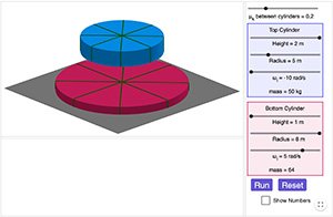 you hit the "Run" button, the top disk drops on to the bottom disk. The exert forces/torques on each other, and eventually reach the same final angular velocity.