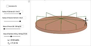 This is a simulation of a rotating solid cylindrical platform with a person on top. Adjust the mass of the platform and person, and the radius of the platform and the person's path, to see how these changes affect the angular velocity of the system and the centripetal force needed to hold the person on the platform.